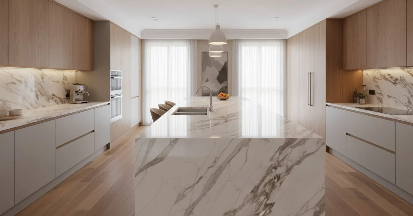 Arabescato Virtuoso captures the timeless sophistication of Italian marble, with a bold yet refined presence. A warm white background is animated by striking taupe veining that flows in dramatic, large-scale patterns across the slab. The interplay of light and dark creates depth and movement, giving each installation the elegance of true natural stone.