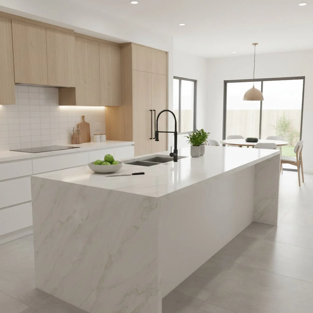 Recommended Applications: kitchen countertops and waterfall islands, bathroom vanities, full-height backsplashes.